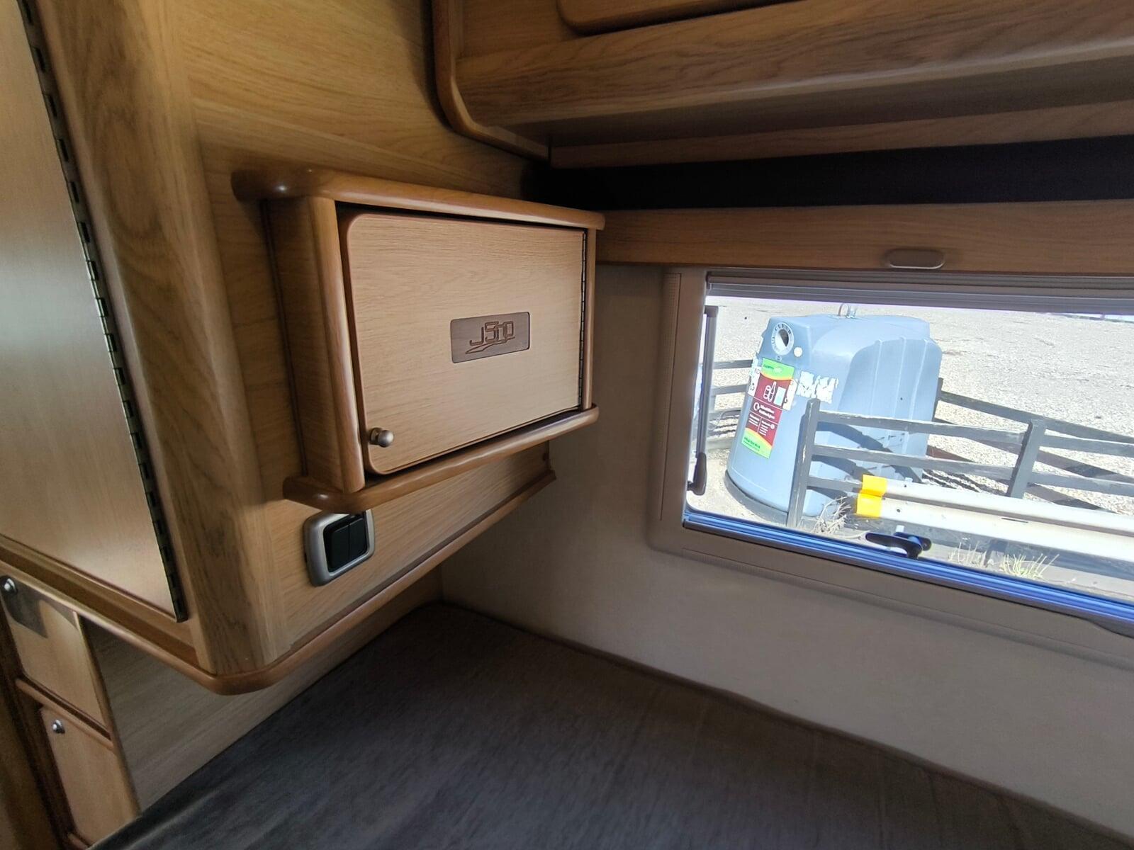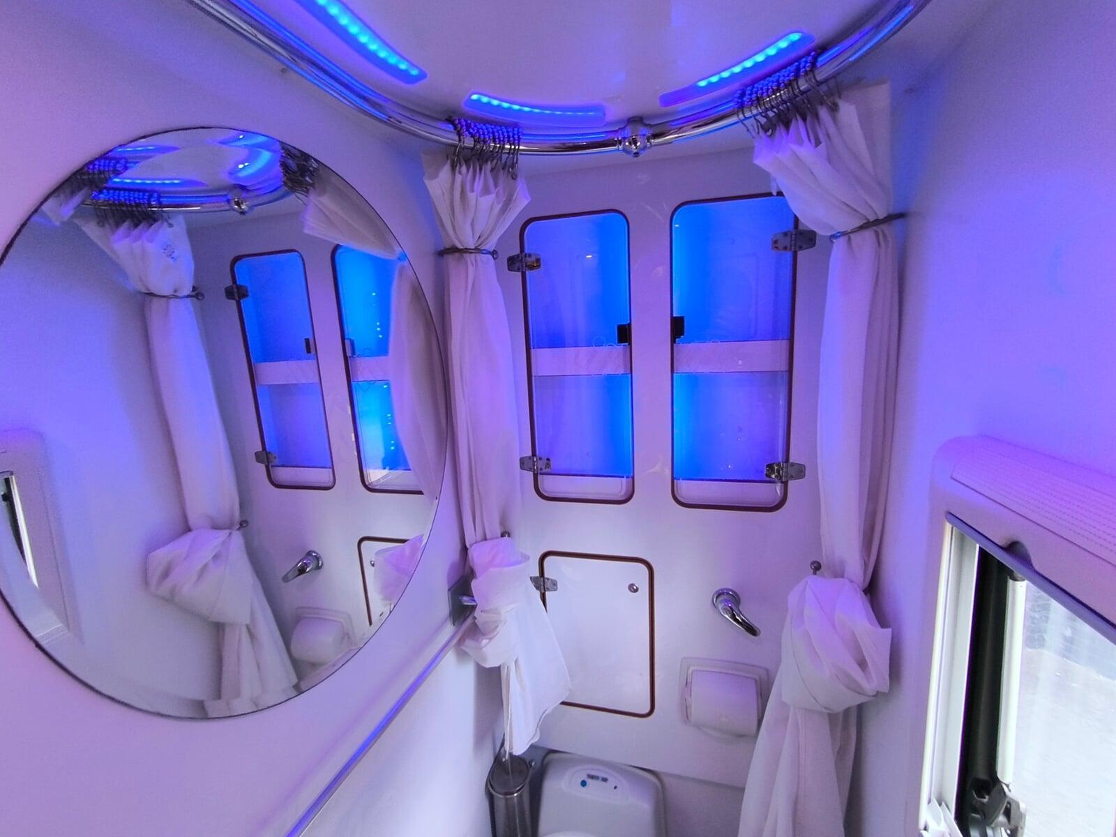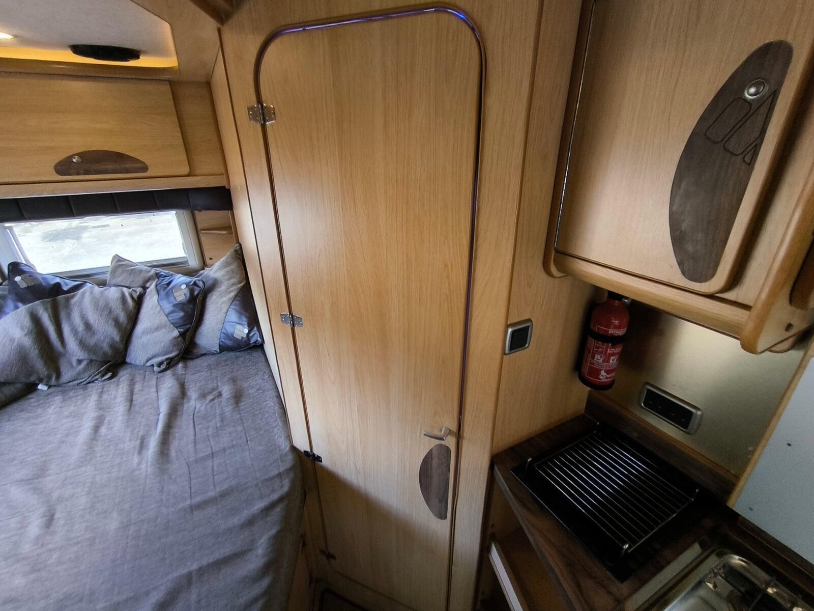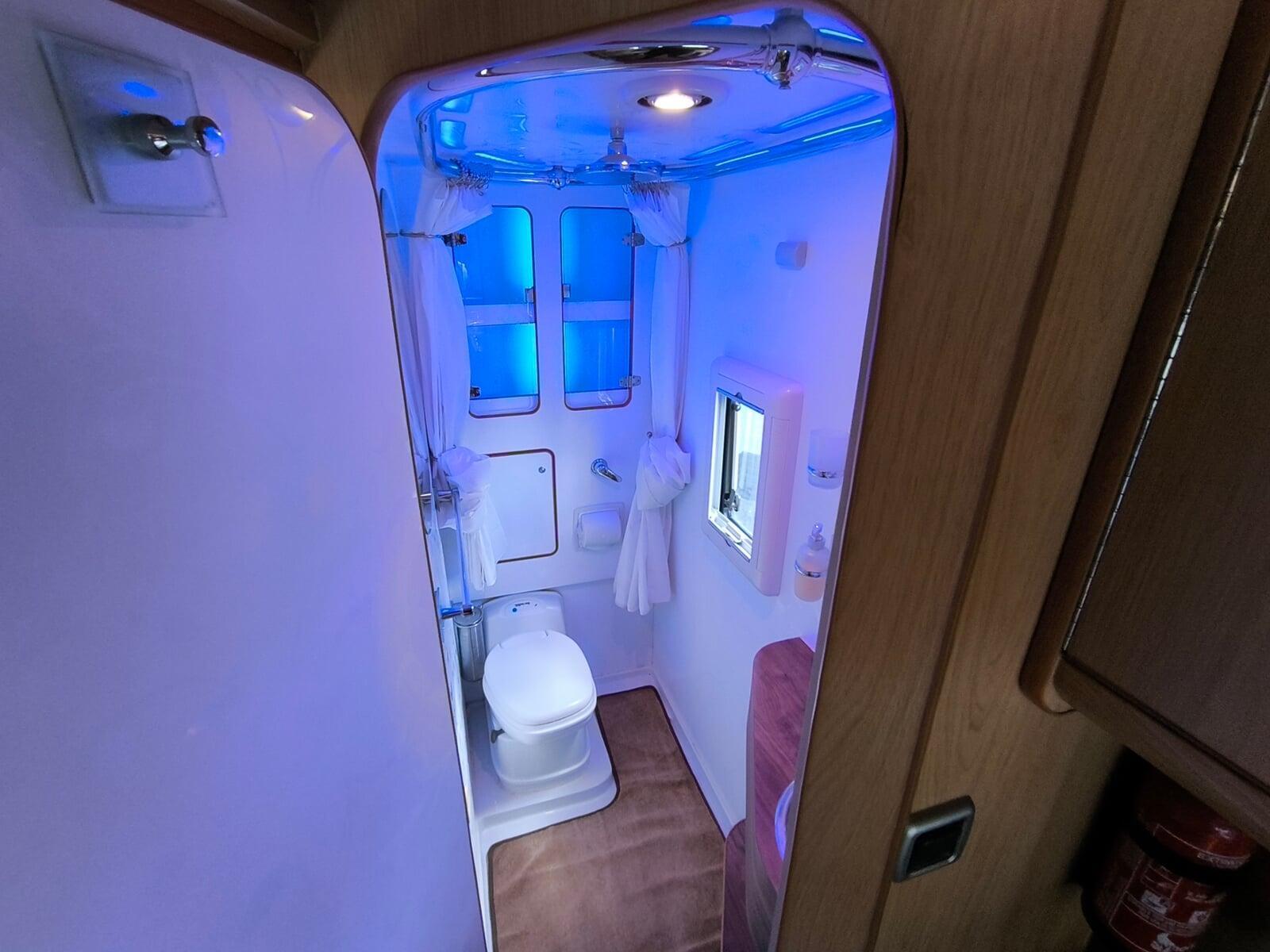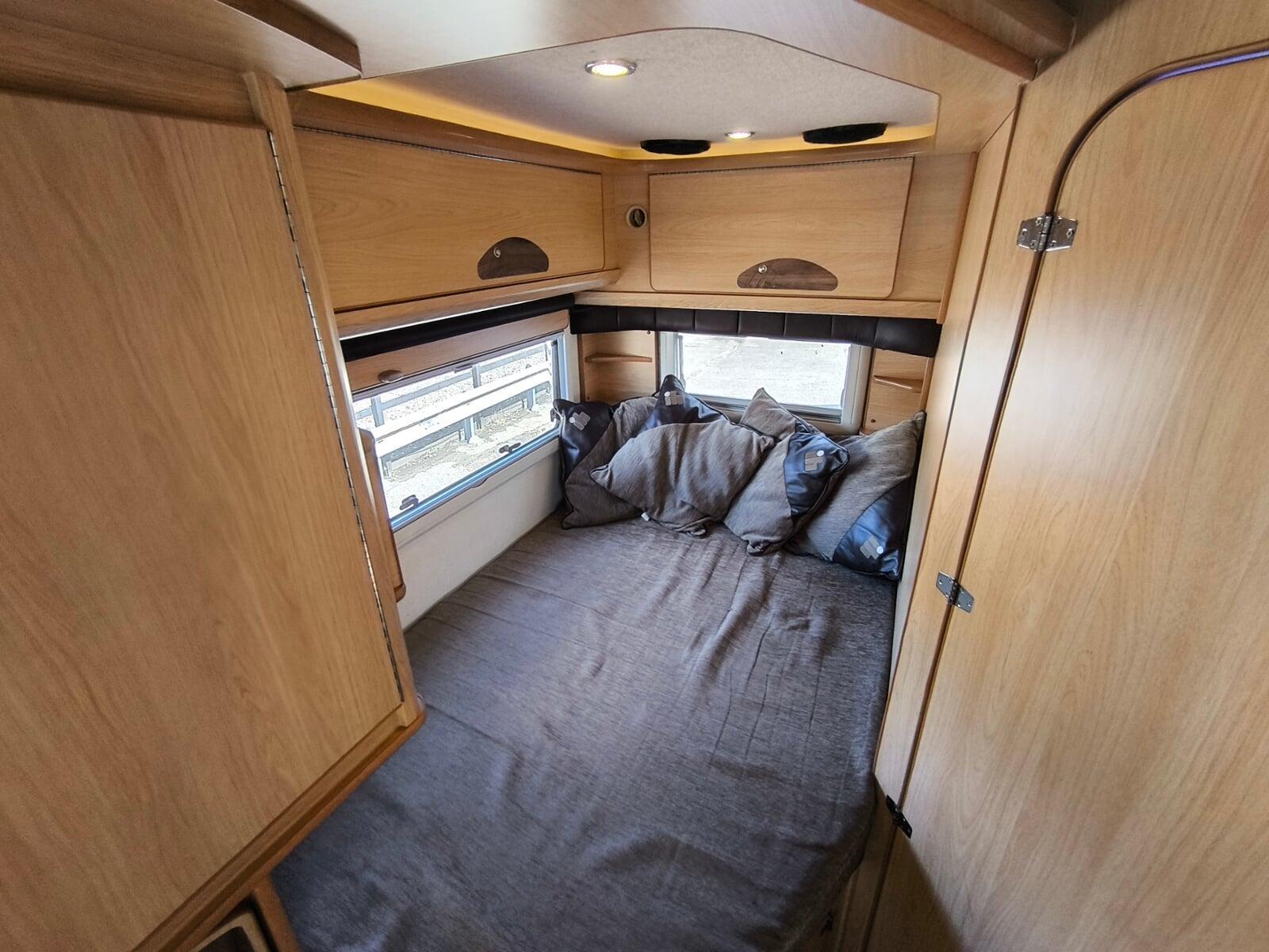 - At the rear, the fixed French bed offers comfort without compromise, complete with under-bed storage for your gear. The bathroom features a proper shower, vanity unit, basin, and cassette toilet – everything you need for stress-free touring.