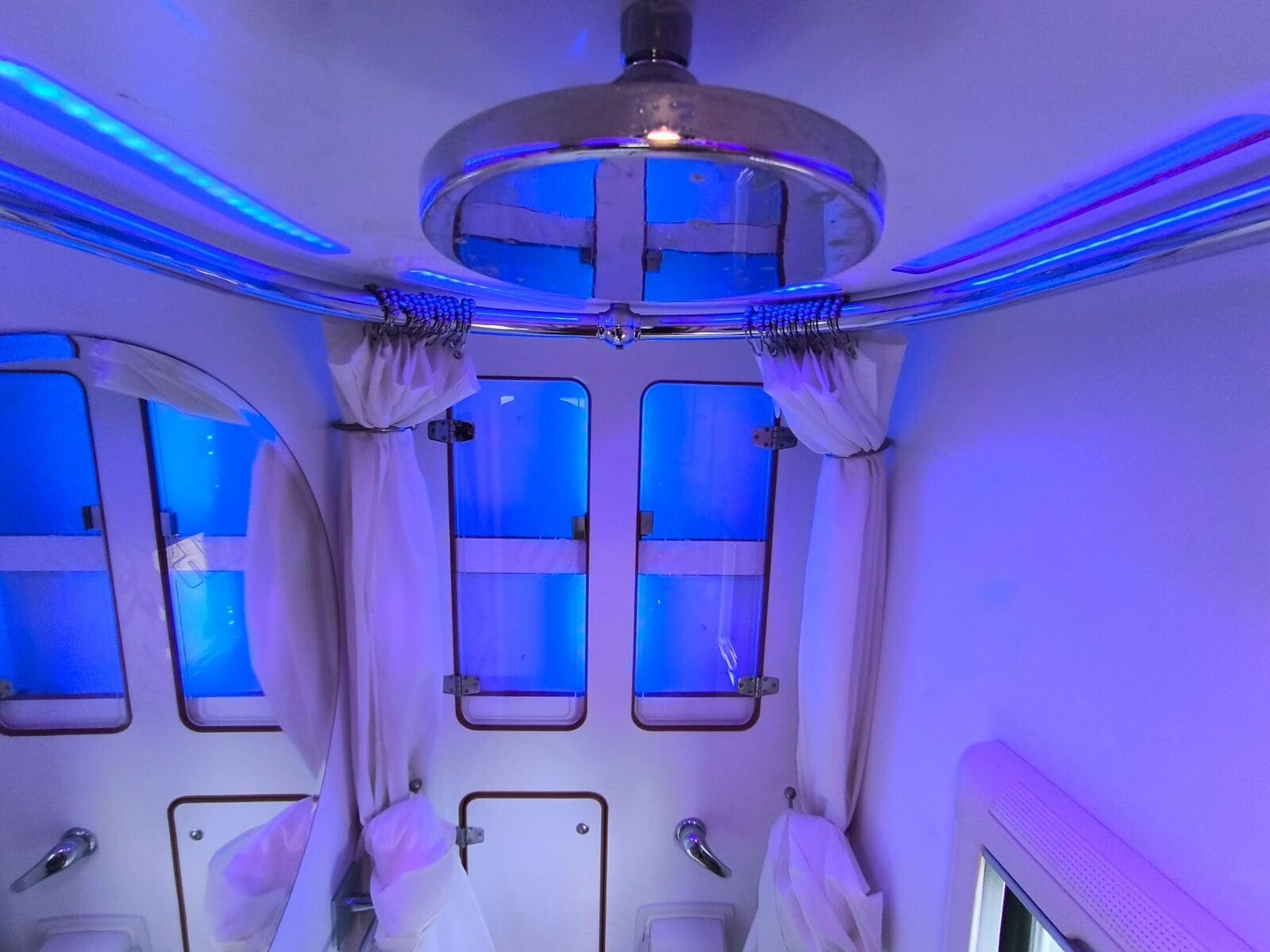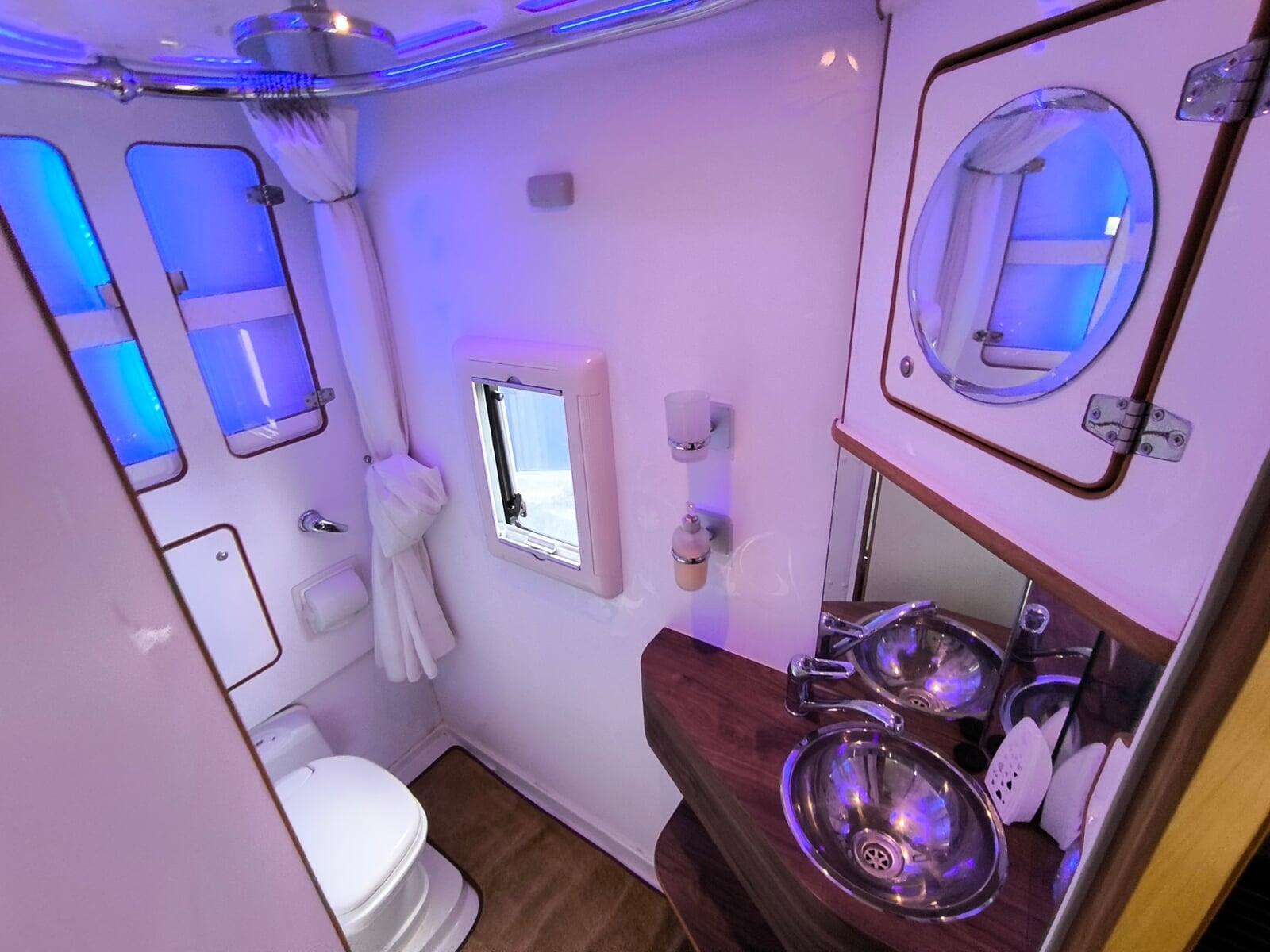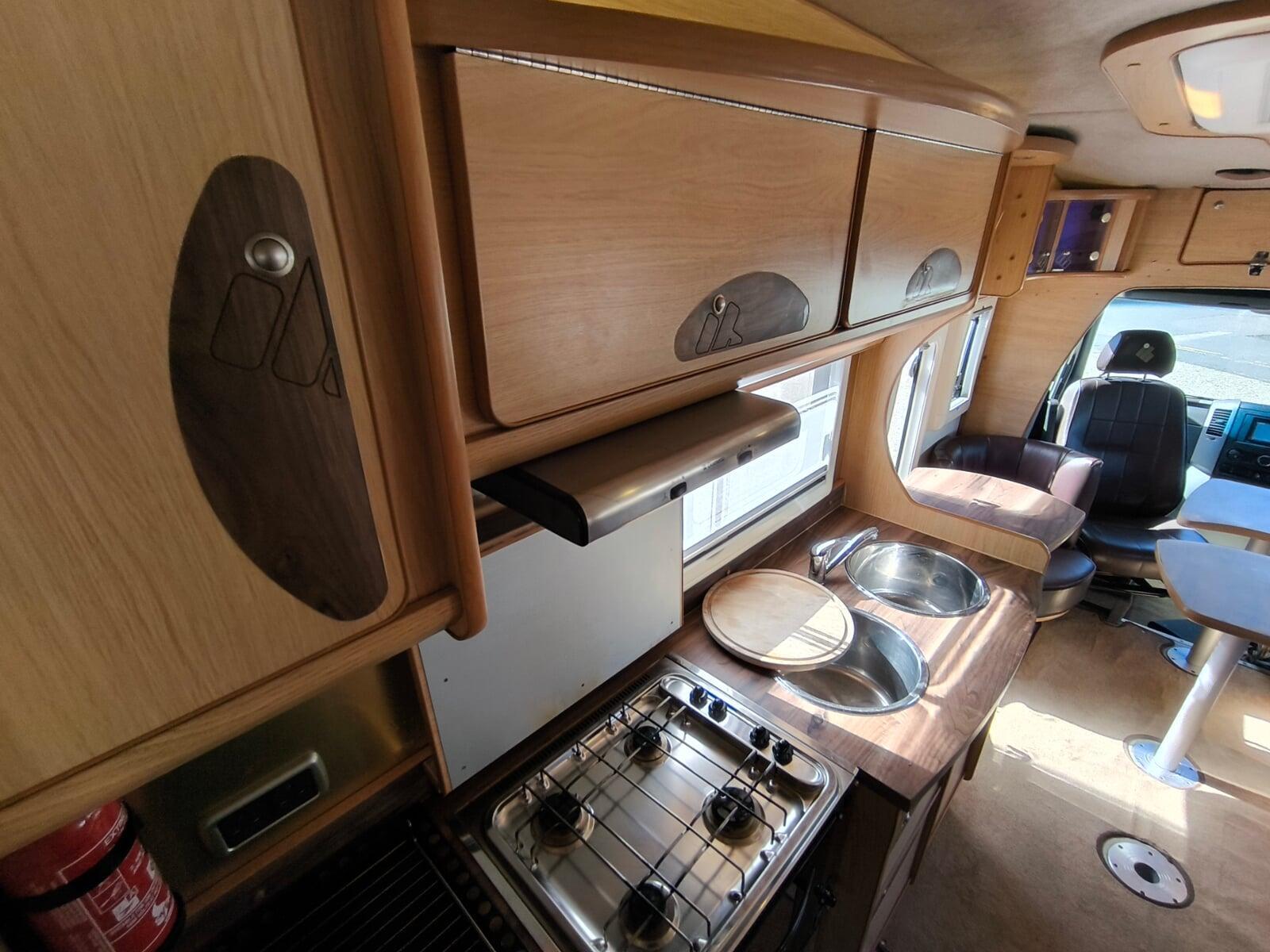 - The kitchen is compact yet cleverly designed: twin stainless-steel sinks, gas hob, oven, grill, extractor, and a fridge/freezer ready for long journeys.